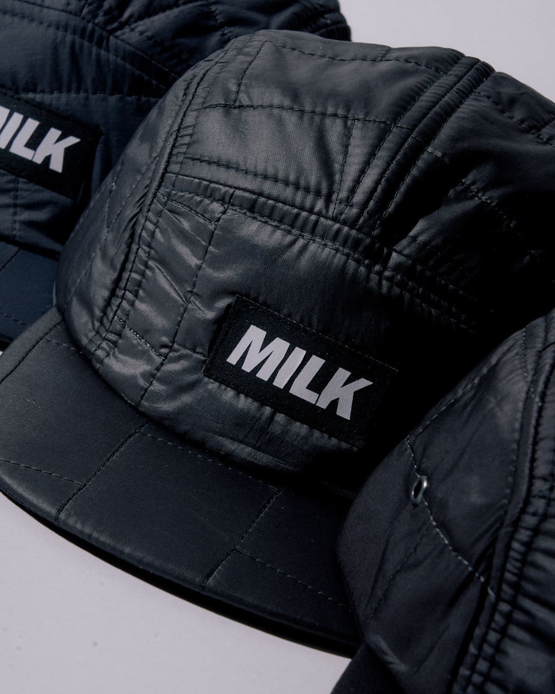 - Precision craftsmanship: a complex cutting process to adapt technical shells and quilted materials into a structured headwear silhouette.